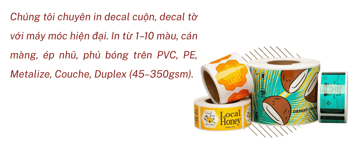 In decal cuộn đang trở thành lựa chọn hàng đầu của hàng ngàn doanh nghiệp sản xuất tại Việt Nam nhờ khả năng tương thích hoàn hảo với máy dán tự động. Không chỉ là một cuộn tem nhãn thông thường, in decal cuộn còn là giải pháp toàn diện giúp tối ưu chi phí, tăng tốc độ đóng gói và khẳng định thương hiệu trên từng sản phẩm.